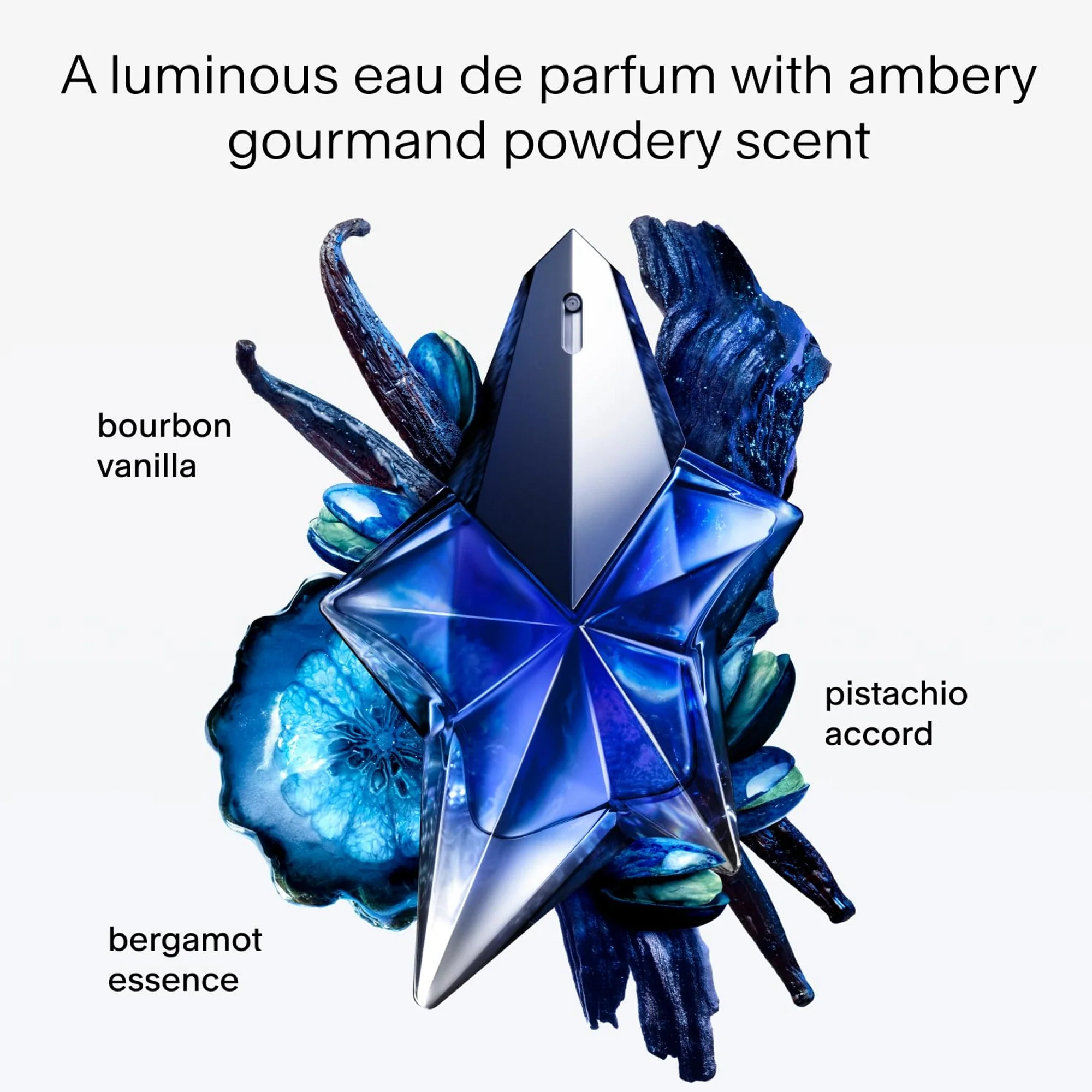 Discover the celestial allure of Angel Stellar Eau de Parfum, a supra-sensual fragrance that elevates Mugler's iconic legacy. This ambery gourmand composition opens with bright bergamot, unfolds into a creamy pistachio accord, and settles into a luxurious base of bourbon vanilla and mysterious woods. The result is a voluptuous, warm embrace that lingers beautifully throughout the day. Housed in Mugler's reimagined cobalt blue star bottle—now refillable for sustainable luxury—Angel Stellar captures the essence of modern glamour with timeless sophistication.
